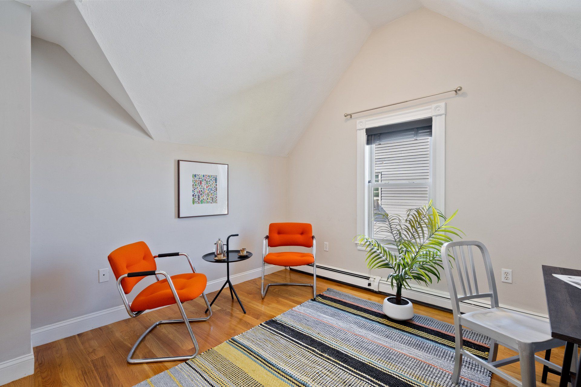 Elfa shelving in 2 bedrooms, counter table & chairs in kit, black iron globe chandelier in bedroom.